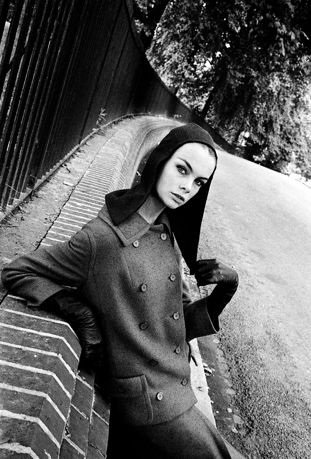Shot for Vogue in the Edgware Road, London in December 1960, Shrimpton peers through the window of a suit hire shop. The image was taken opposite the former Woolworths department store. The location was identified from a reflection in the shop window on an alternative image from the shoot. The road in the background leads to Crawford Place W2 which is almost unrecognizable in comparison today.