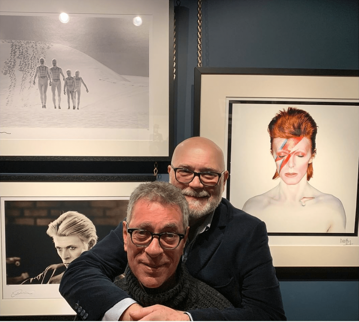 Chris Duffy and Geoff MacCormack seen alongside their exhibited photos at the opening of Masterpiece Art in Holland Park, London 9th January. The gallery is showing a unique set of five silkscreen prints on Japanese drawn by David Bowie and titled 'The Arcane Series’ which is based on the tarot -Lovers, Death, Star, Moon & Earth. The exhibition 'Bowie: From Major Tom to Major Arcana' is available to view until 20th February.